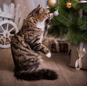 Speziell junge Hunde und Katzen sind von festlich geschmückten Bäumen fasziniert. Auch wenn es drollig aussehen mag, wenn das Kätzchen oder der Welpe versucht eine Kugel zu fangen oder ins Astwerk zu klettern, kann dies sehr gefährlich werden. Ein Baumständer, stabil und schwer, kann hier gute Dienste leisten, ein Unglück zu verhindern, ebenso ein gut gewählter Standort des Baumes.